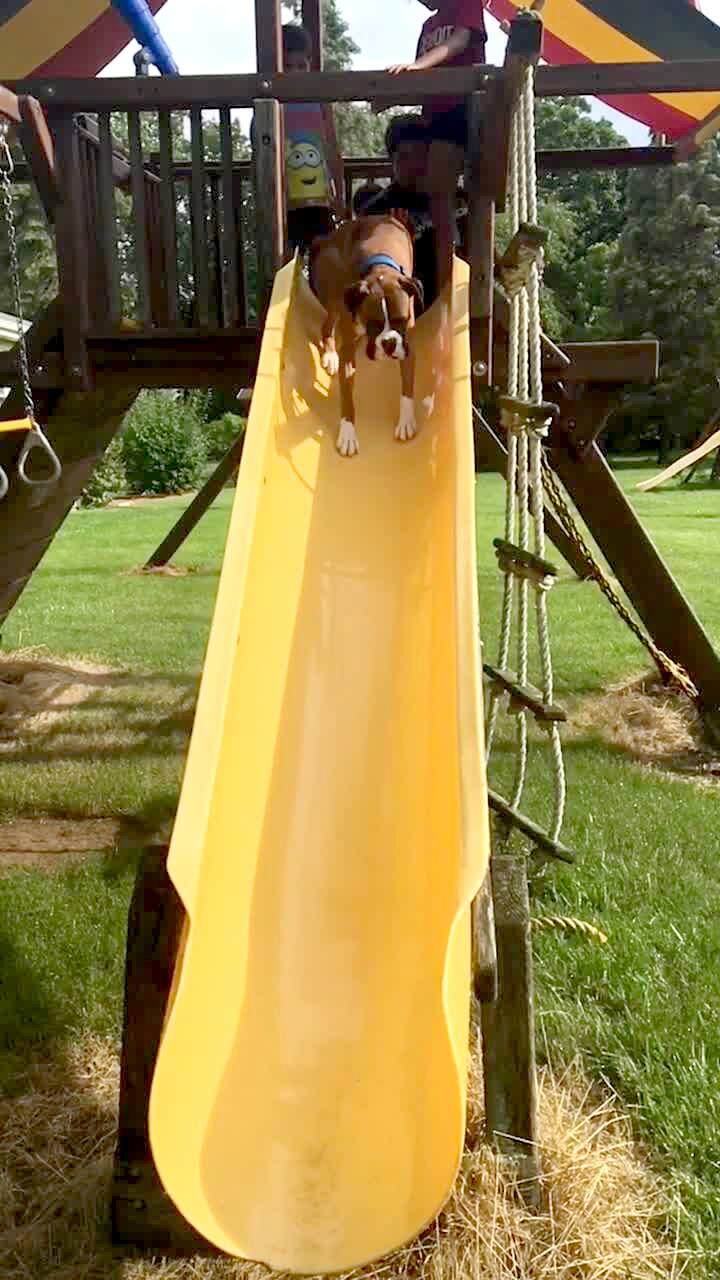 A dog goes down a slide in slow motion and falls on its back at the bottom.