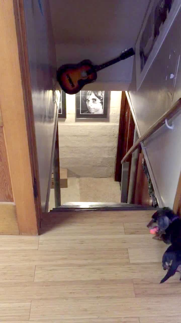 A dog misses a ball in the air in slow motion and falls onto its back. Slo-mo
