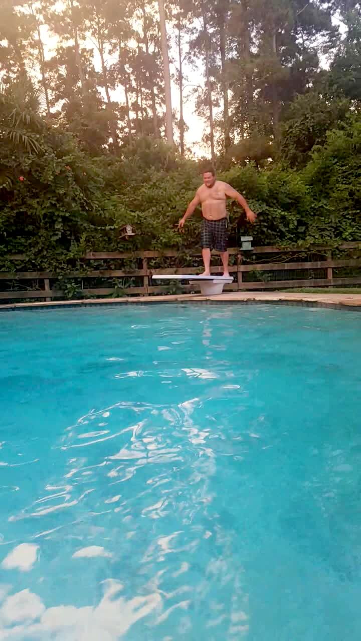 A man runs up on a diving board outdoors and when he runs off it, it breaks off and falls into the pool with him.