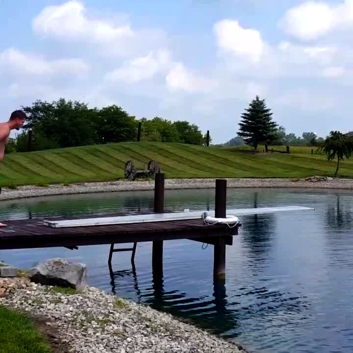 An adult man tries to run down a diving board attached to a dock and do a backflip, but slips and falls into the water outdoors.