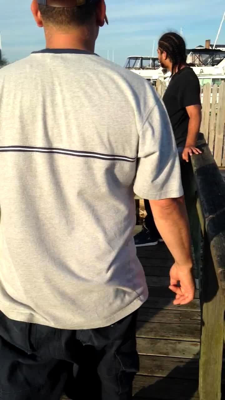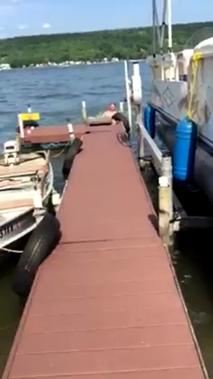 A man slips, as he tries to step onto a dock from a boat and falls backwards into a lake.