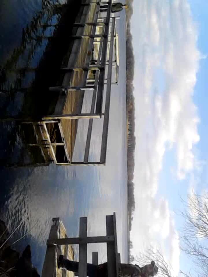 A man walks on dock to get to other side and dock breaks and he falls into water.