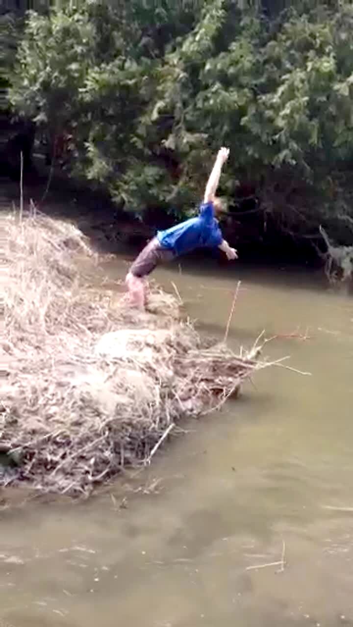 A man runs and jumps across a creek, sticks the landing, then falls straight back into the water.