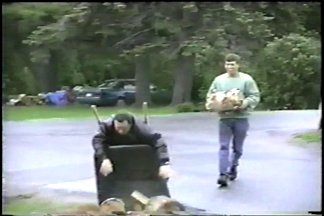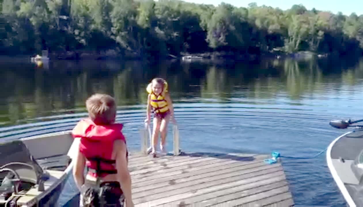 A little boy runs and tries to jump off of a dock but comes up short, bouncing off the wood and into the water. Start at 0:44.