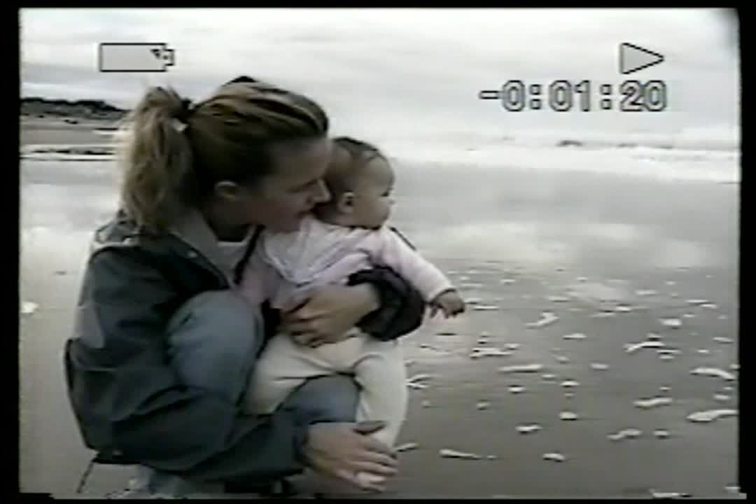 A woman poses for a picture in front of the ocean. A large wave hits the woman from behind and she falls down.