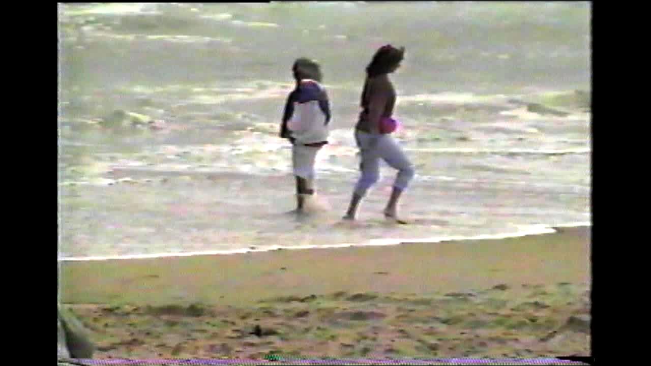 A woman dances outdoors at a beach in the surf, then falls over into the water.