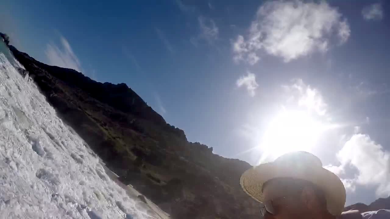 A woman stands on a rock when a wave crashes into her and knocks her over. Slow motion.