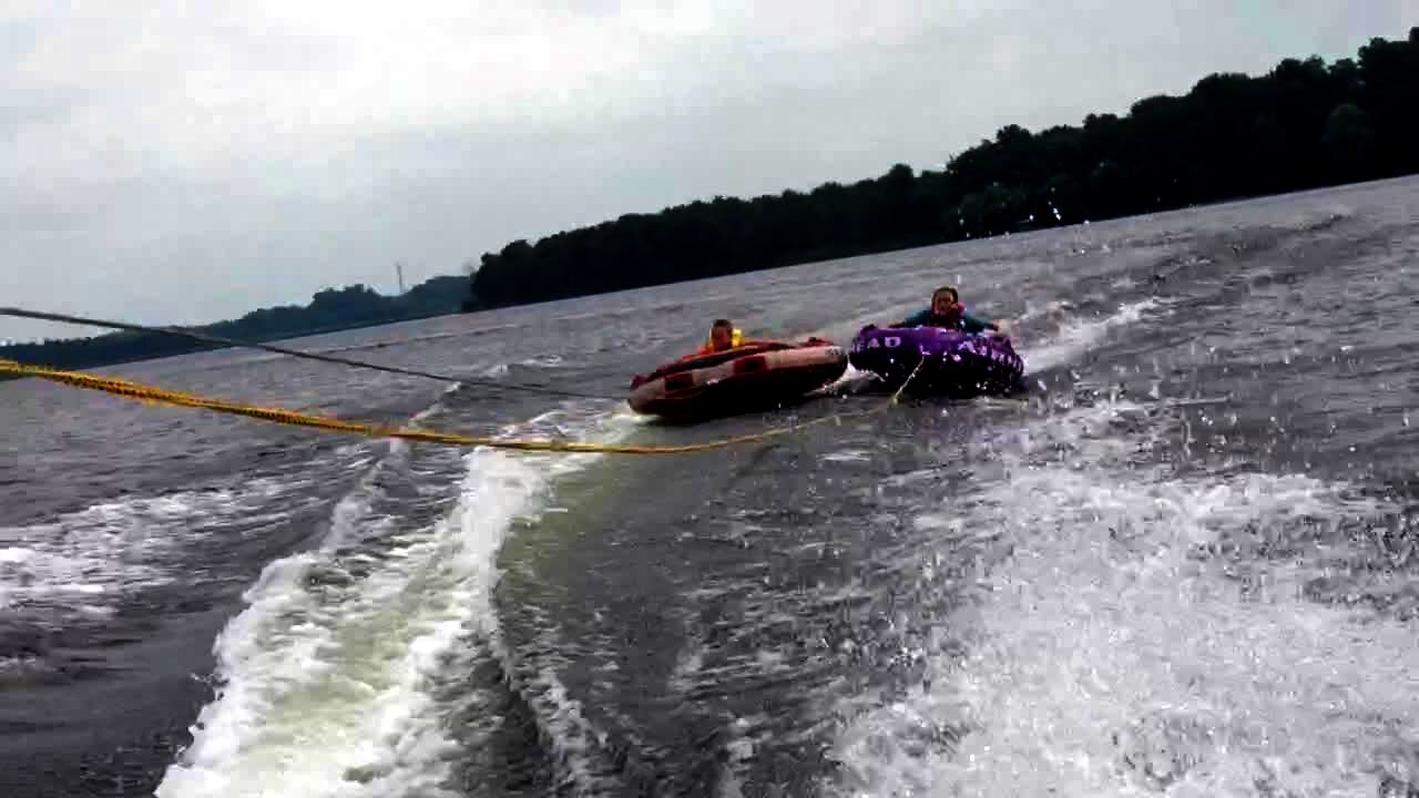 A boy and a girl ride on tubes tied to a speed boat when the boy's tube flips up and he briefly lands on the girl's tube before falling into the water and causing the girl to fall as well.