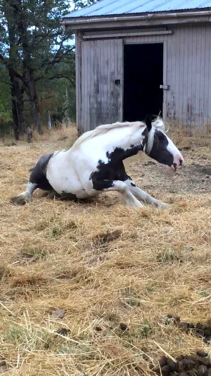 A Horse rubs his stomach against the ground to scratch an itch and a song plays over the video to make the horse look like he's dancing.