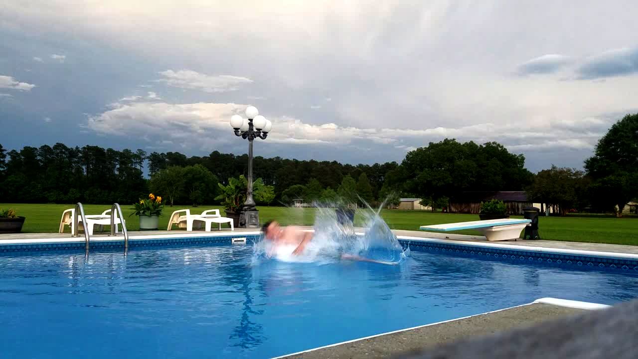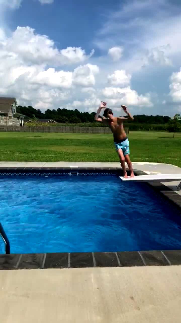Group of kids and teens get ready to jump into a pool. Boy slips and bounces off of diving board