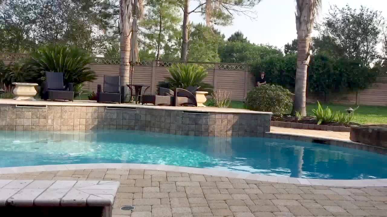 A group of teen boys do a basketball trick shot where one boy throws it across the yard to other boys at a pool who catch it and pass it to each other and the last boy shoots it into the hoop in slow motion.