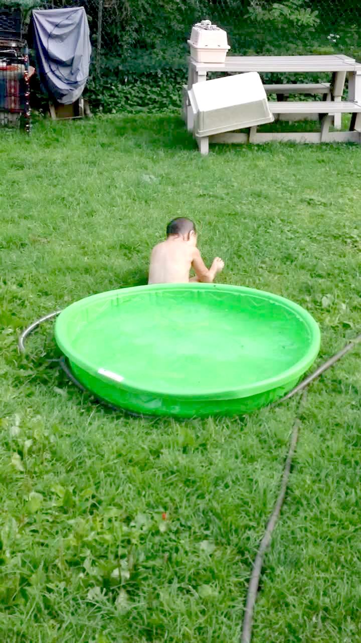 A tot boy misses the kiddie pool when he tries to jump in backwards.