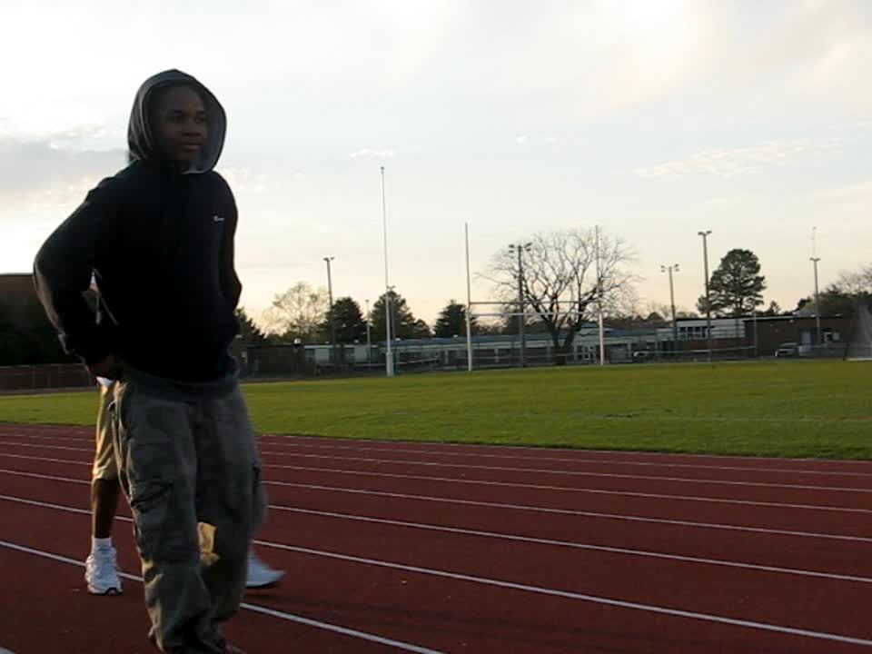 Teen boy on school track jumps a fence and flips over it, laughs. Sports mishap.