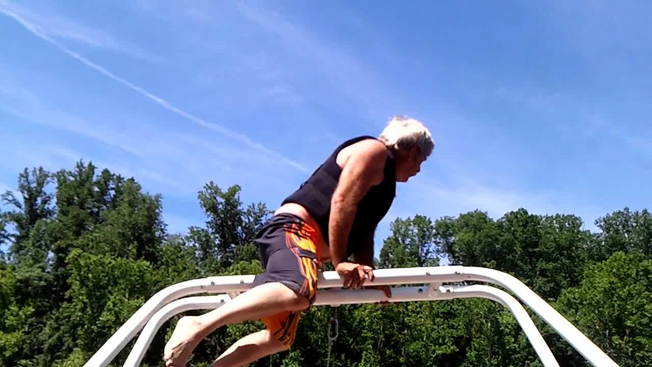 As a young boy in the front yard plays with two dogs, a man rides his bicycle up a ramp but he gets stuck at the top and falls off. He groans loudly.