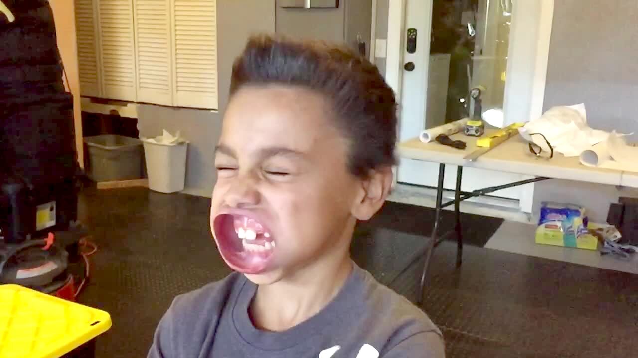 A young boy puts an air compressor up to his face. He says, "I've been waiting for this moment my whole life." As he turns it on, it blows a booger from is nose onto his forehead.
