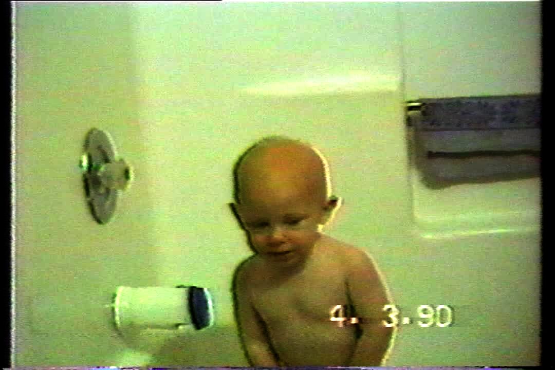 Little girl & tot boy are covered in bubbles in bath tub. Boy slips / falls under & disappears, then stands up opening his mouth wide. Short tail.