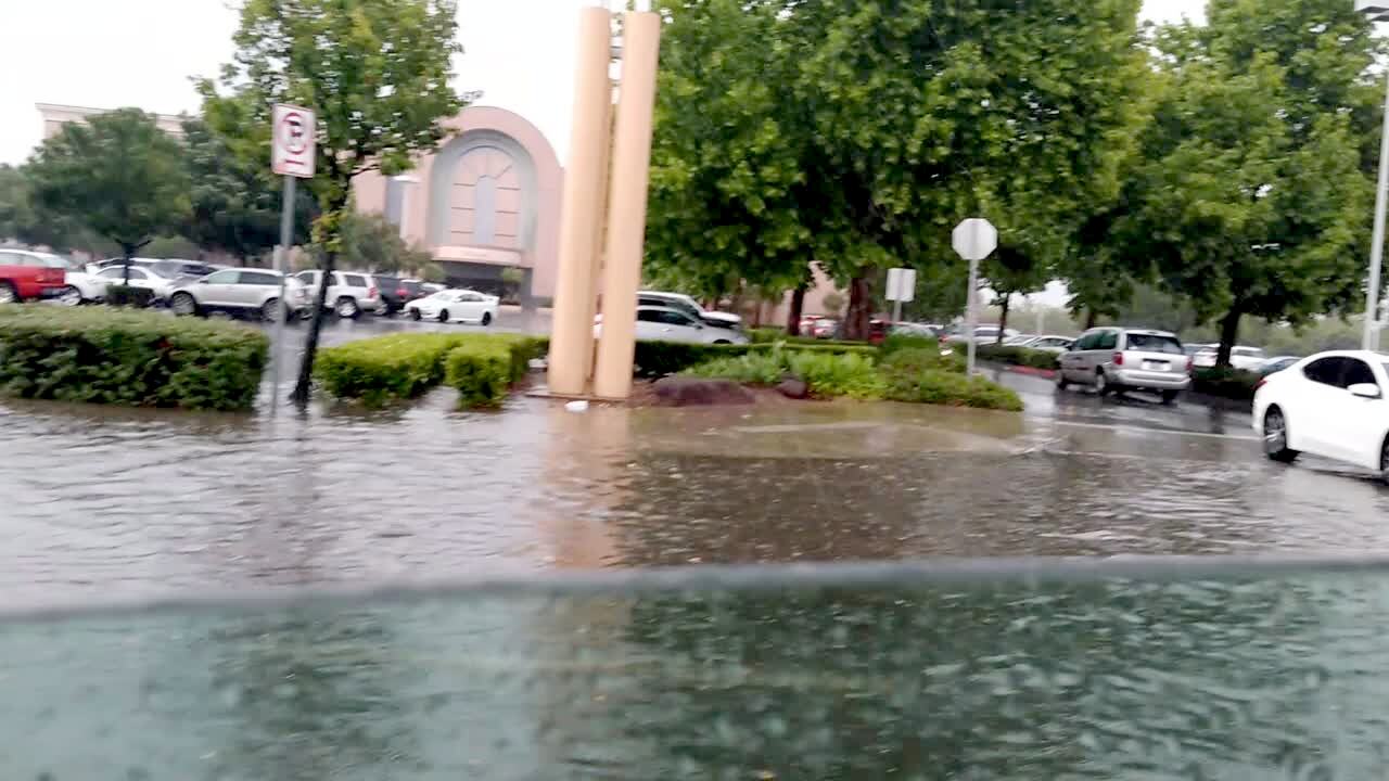 A woman records a video of a flooded street and a car drives past and splashes into her car.