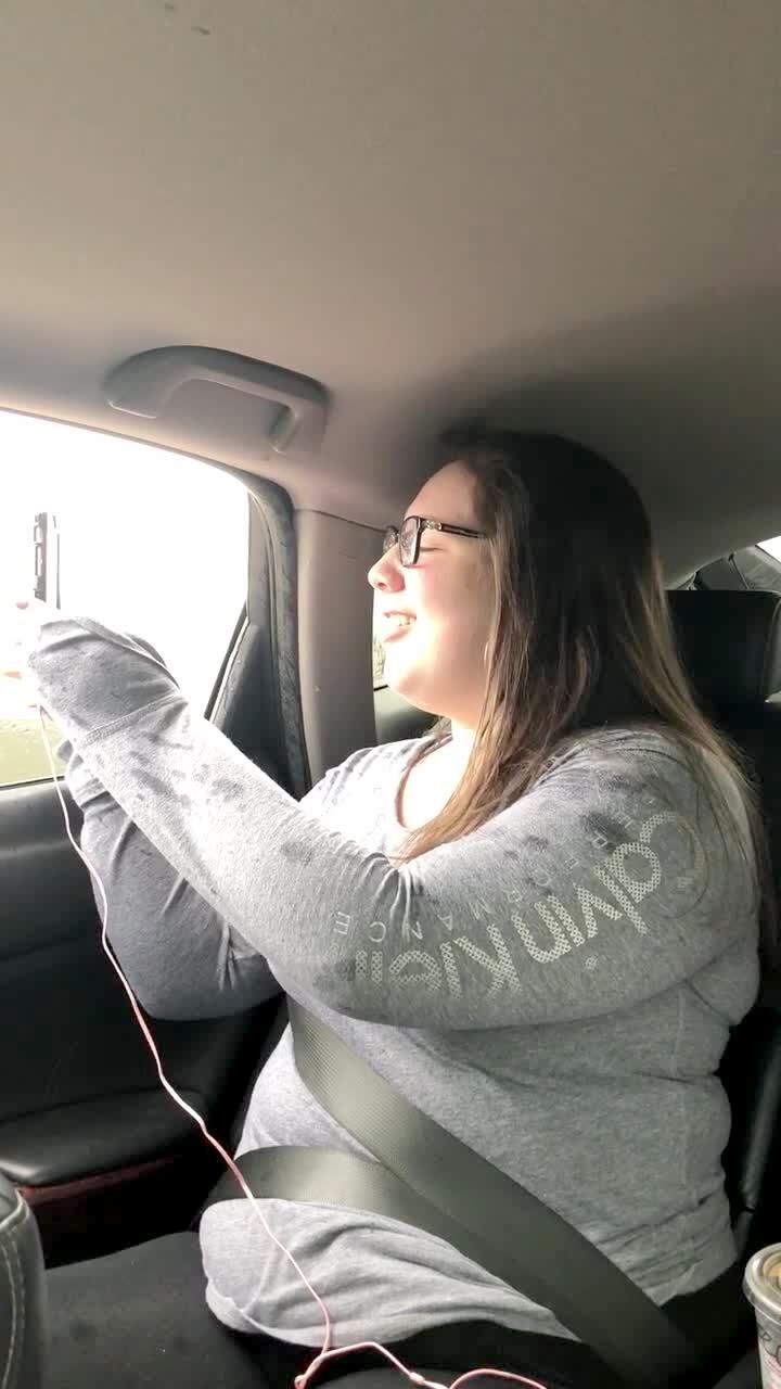 A woman brushes her teeth in the car and tries to spit out the open window, but toothpaste gets all over her face and hair.