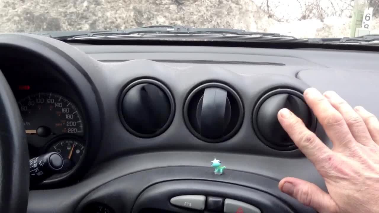 A woman spins two air conditioning vents on her car dashboard.