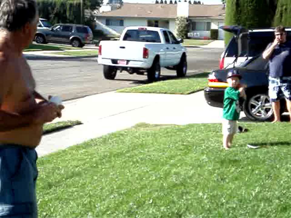 A woman says "head catch," then throws a baseball cap onto a tot boy's head in a backyard and laughs.