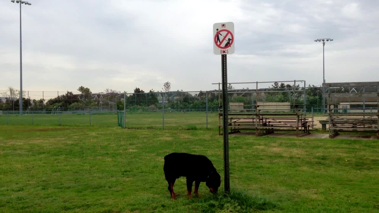 BIG DOG, LITTLE DOG Little dog pees on big dog and then kicks dirt on him
