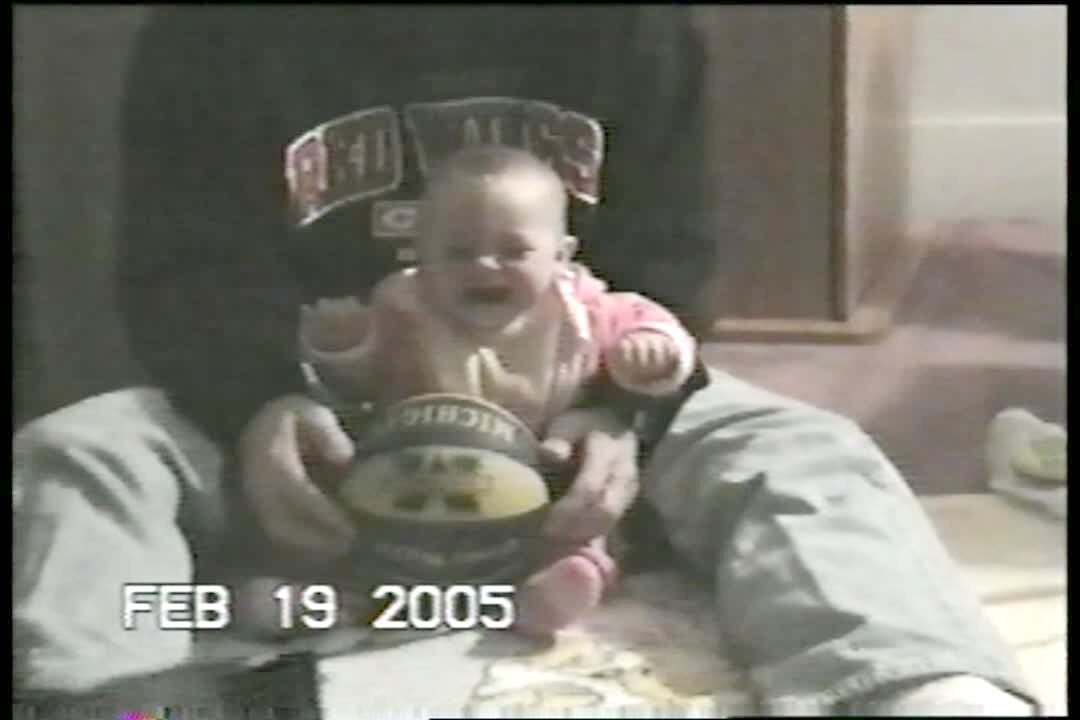 Baby sits in man's lap & laughs hysterically when man & dog pass ball back & forth to each other. Dog barks / growls, hits ball back to baby with its nose.