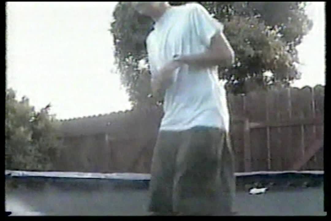 Man lying under trampoline gets hit in the face by person jumping on top of the trampoline. Bonehead. No tail. Backyard.