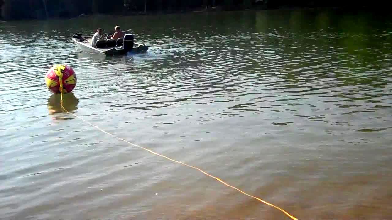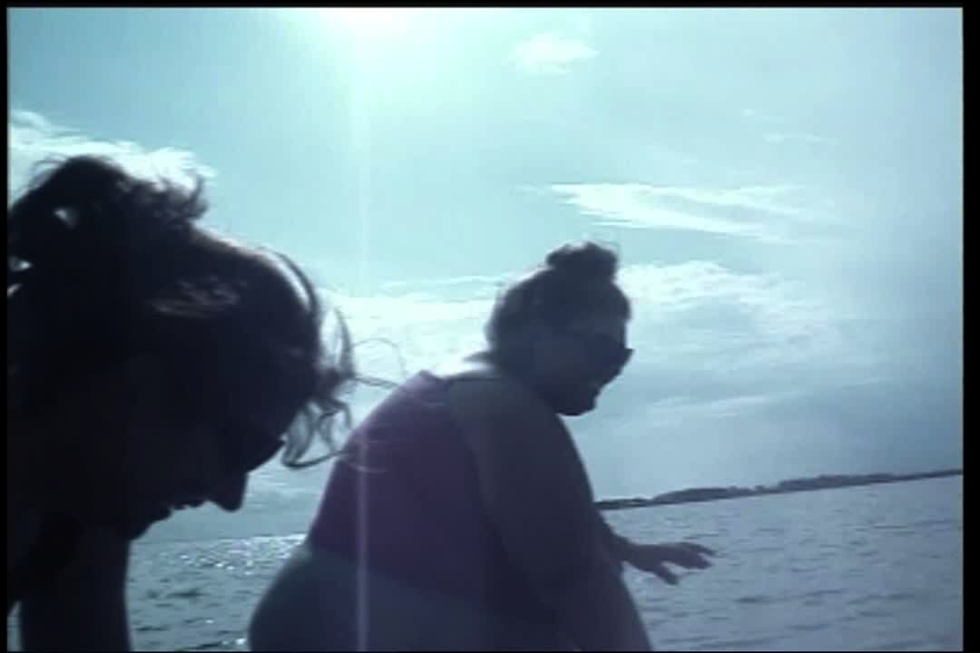 A woman catches air as she gets tossed up off of an inner tube while pulled by a boat. Music rights not cleared.
