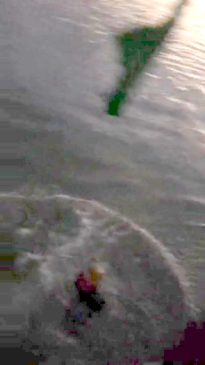 A woman can't get into kayak/boat. She keeps falling over into the ocean water.