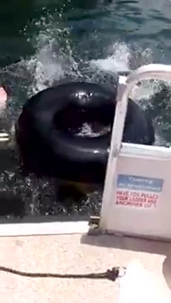 Woman tries to sit on an inner tube on the lake. She falls backwards into the water.
