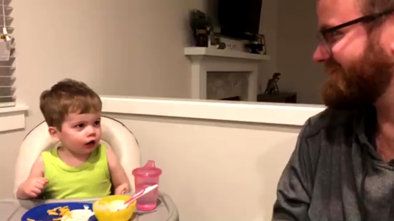 A dad and a tot boy sit at a dinner table and scream repeatedly and laugh. The dad screams loudly and the tot gets scared but laughs.