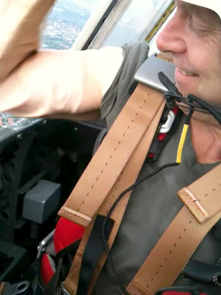 A man sticks his arm out of a stunt airplane while flying and his skin wrinkles in the wind.