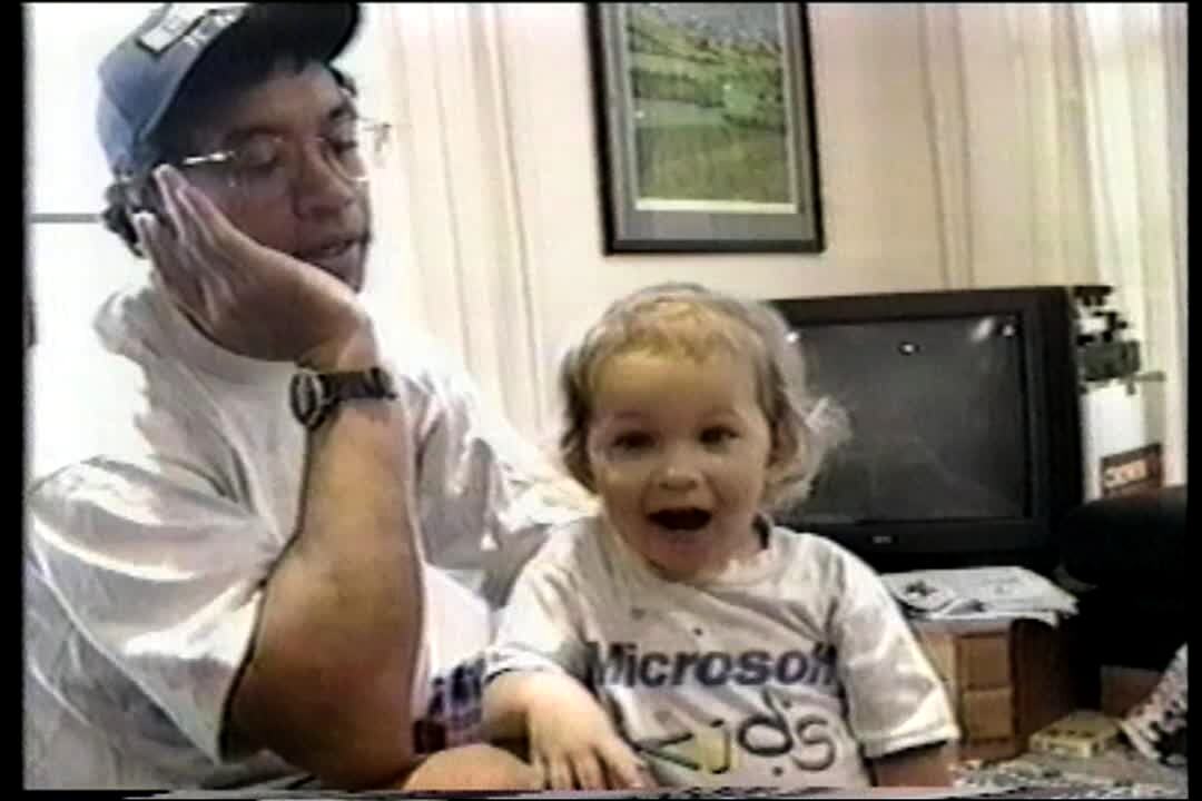 Baby boy says "daddy" after man off camera asks him to "say daddy."