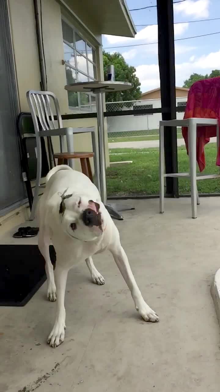 A wet Mastiff dog shakes herself dry in slow motion.