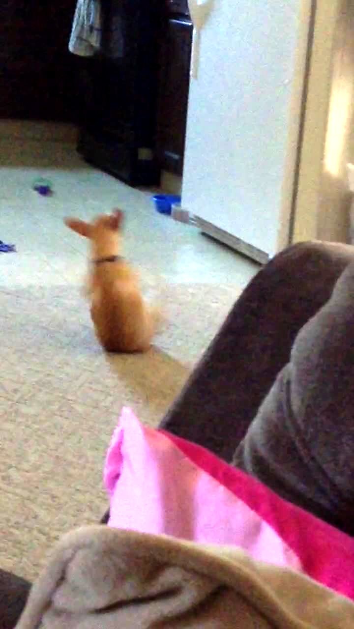 A chihuahua dog flings the bottom half of his body left and right repeatedly indoors.