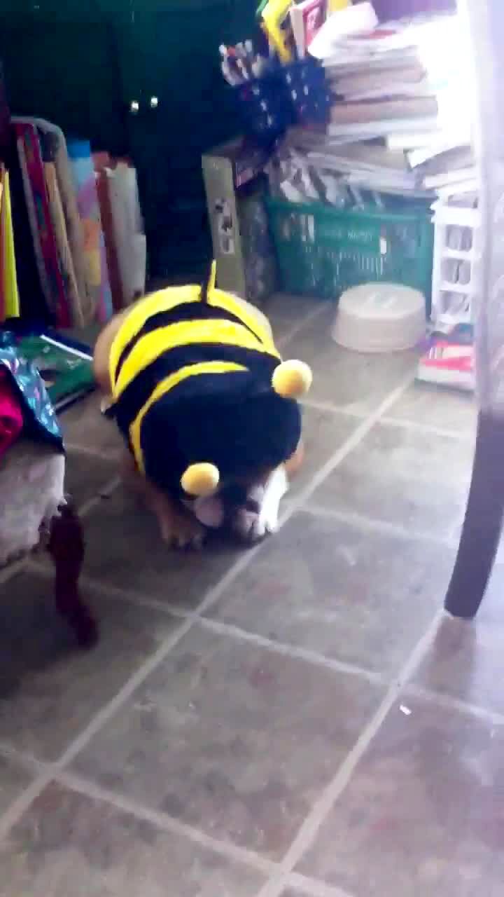 A bulldog dog shakes her head in a bumble bee costume not able to see.