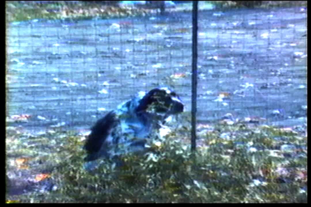 A dog shakes itself dry in slow motion. The dog's ears and jowls flap.