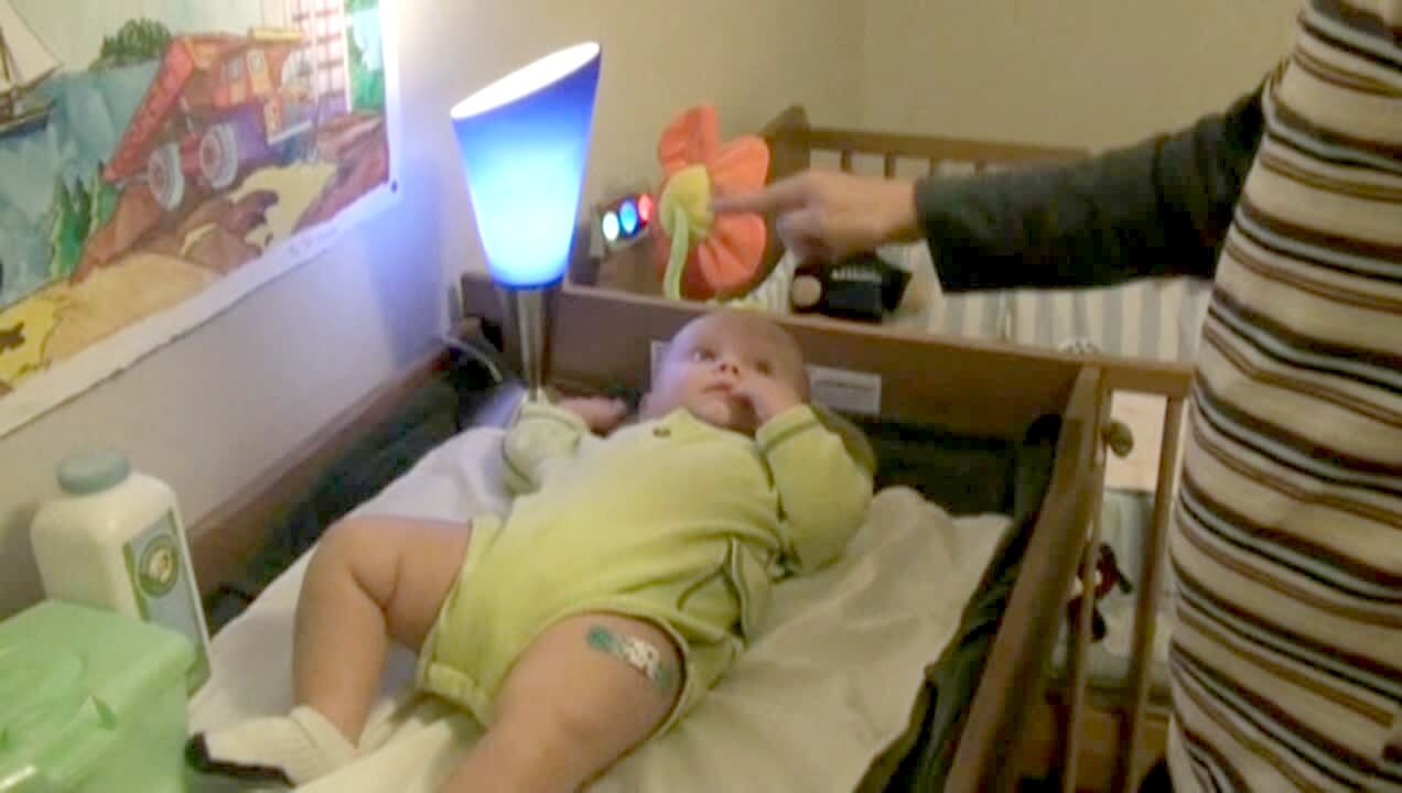 Baby lies on a changing table and leans on a touch lamp. When dad touches the baby, the lamp turns on and off.