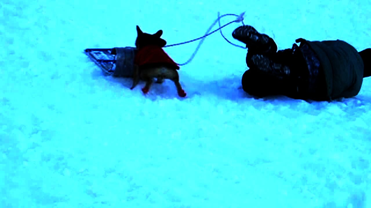 Boy rides sled down hill, small brown dog tries to get on the sled while the boy is moving. Boy falls off the sled & dog hops on, rides the rest of the way. Winter.