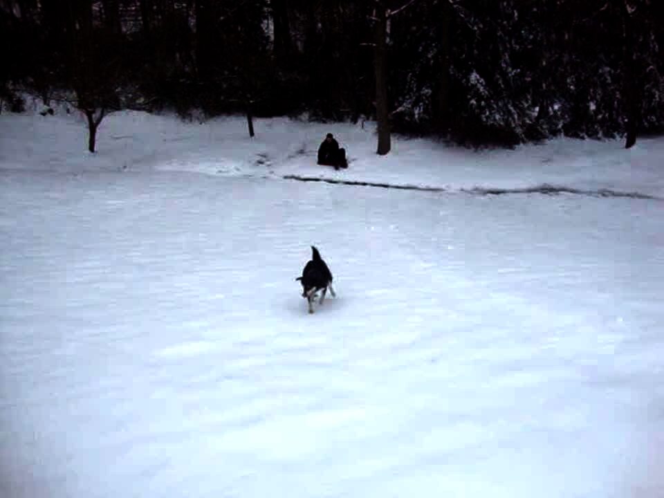 "Icy Does It" Boy and Rottweiler dog keep sliding down icy snow in backyard. Dog almost makes it, but slides back down at the last minute. Slippery, winter. Ice.