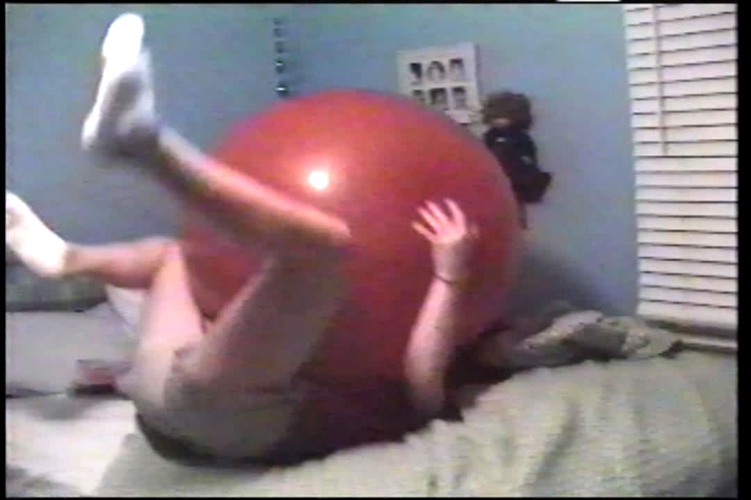 Teen girl jumps on big pink yoga / exercise ball and falls hard. Bonehead.