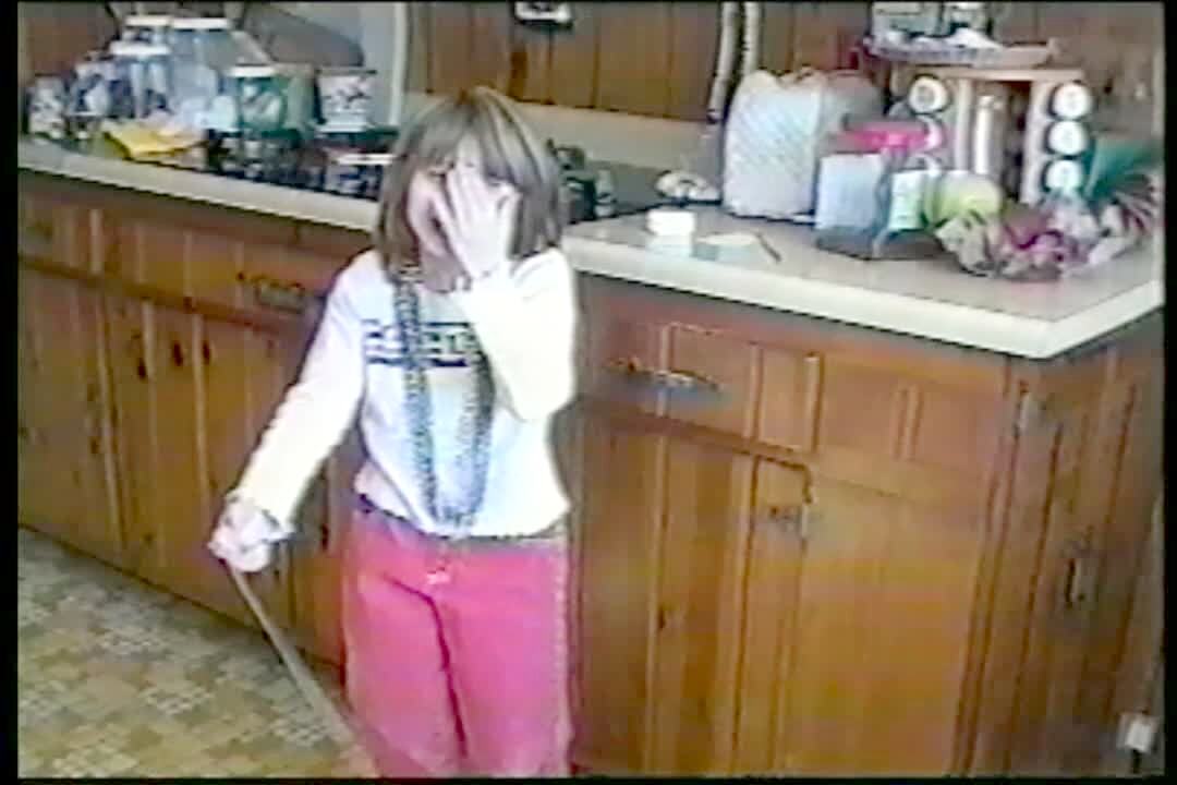 A teen girl uses stretch bands to exercise in the living room and the band slips off her foot and hits her in the back of the head.