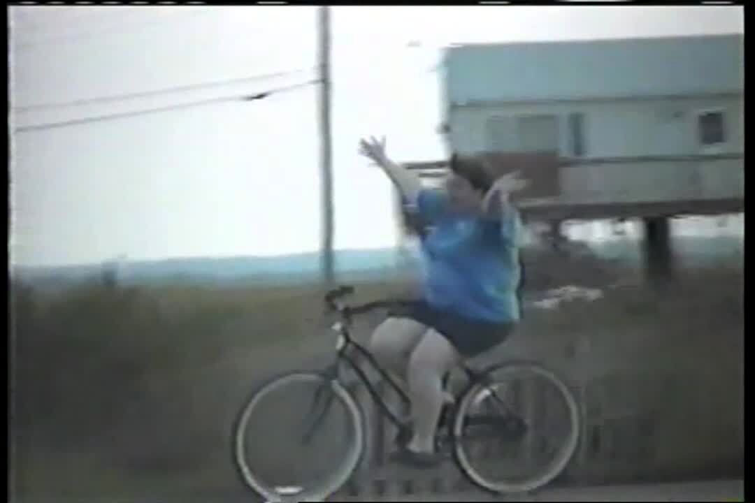 A woman is being taught how to ride a dirt bike. Start at 1:10. She rides into a chair and a fire pit and then says "I am done. I am fucking done."