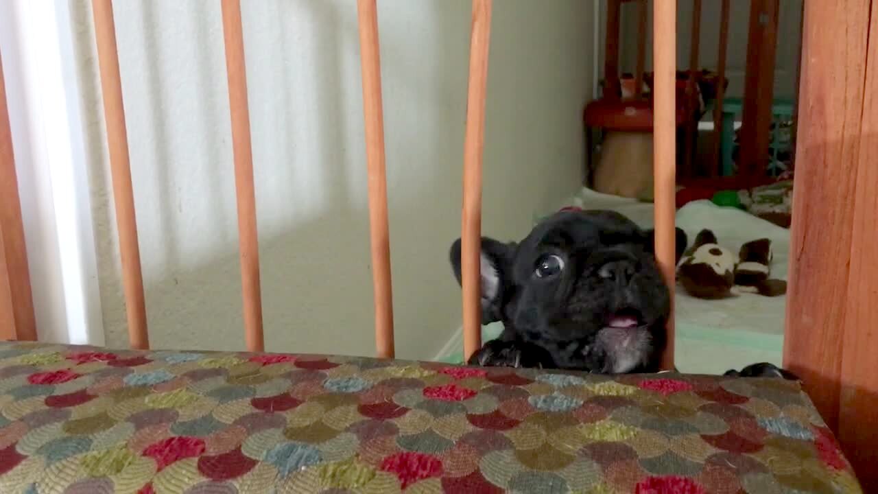 Cute puppy dog is sitting on bed. Shooter says "say something," and the puppy whines.