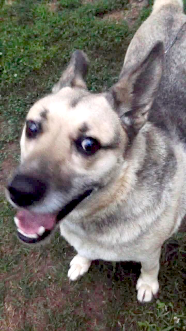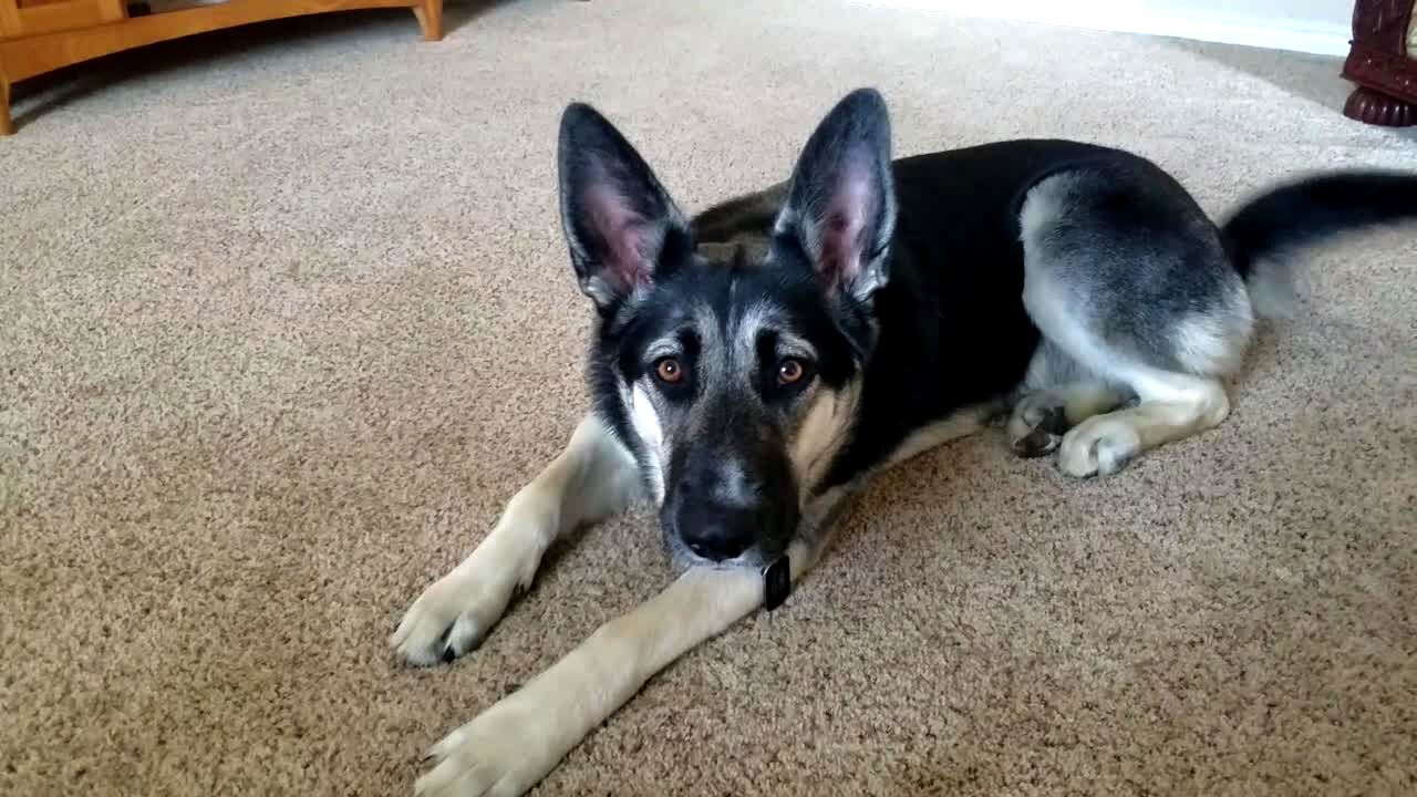 A German Shepherd dog whines and moans as a woman tells the dog that she loves her.