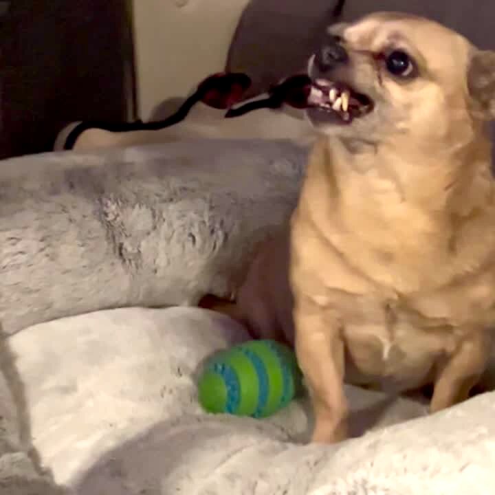 A dog sits on a couch and an off-camera woman says "How's it going?" The person puts a camera in the dog's face and the dog shows their teeth and growls each time the camera is held up in front of them.