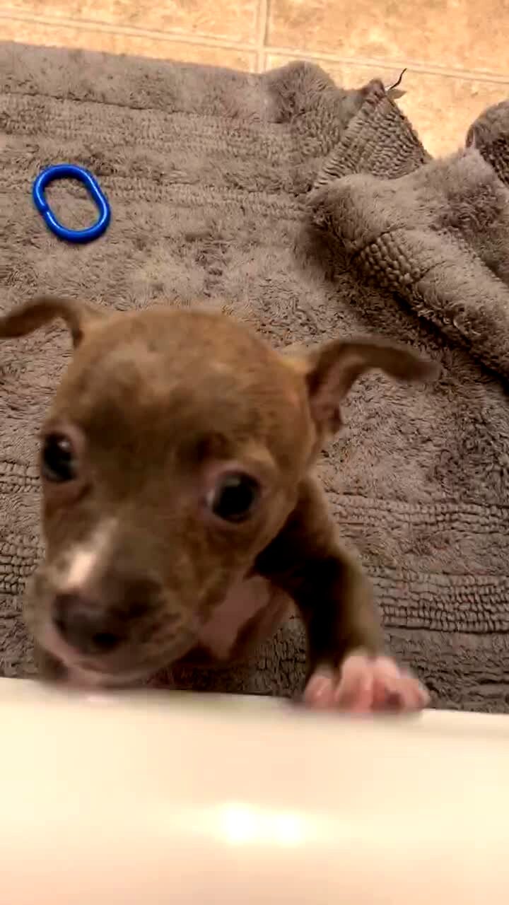 A puppy dog screams repeatedly at a woman while she's in the bathtub in the bathroom.