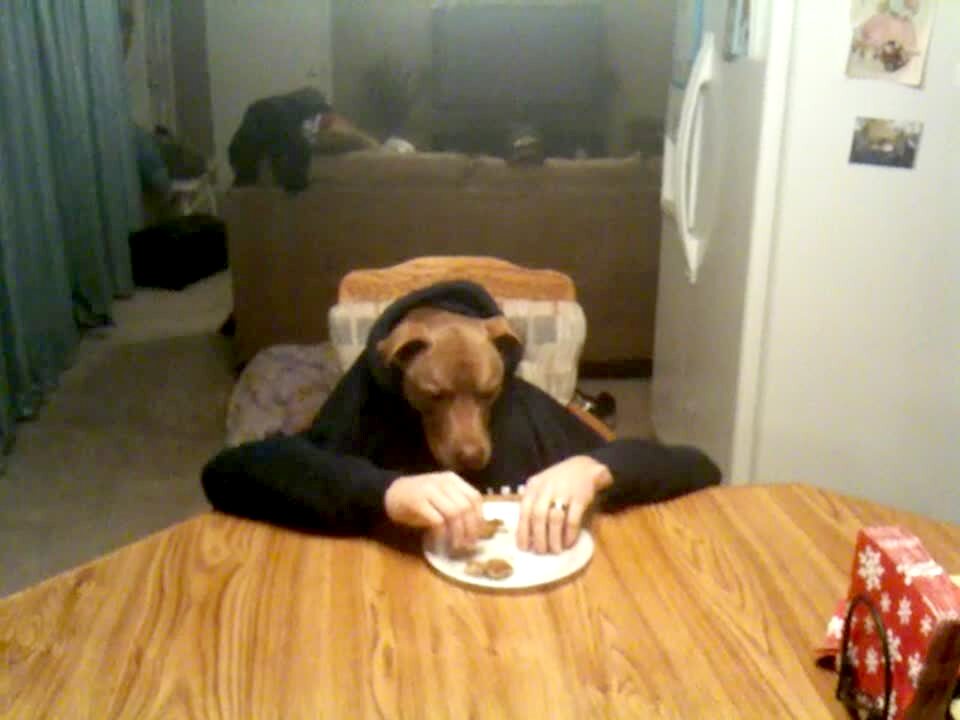Woman's arms are sticking through a shirt while a black lab dog's head comes out of the neck hole. Looks like dog is eating with human hands.