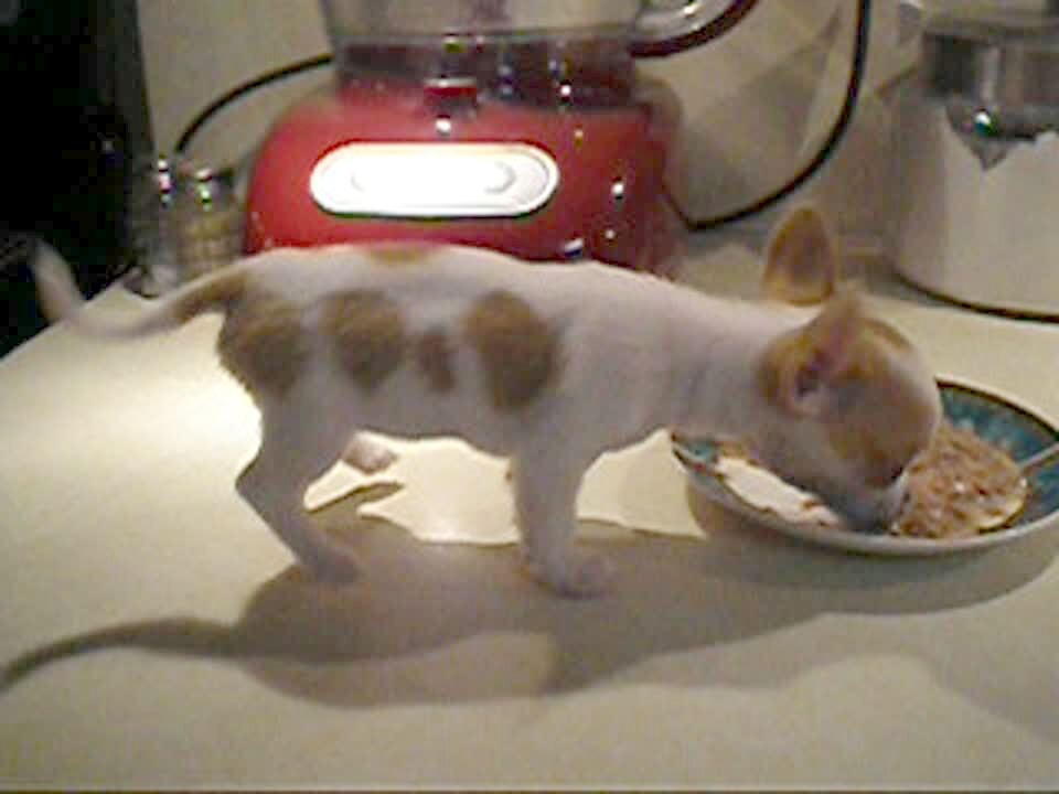 Chihuahua puppy dog lifts back legs as she eats, kind of weird but cute. Clip repeats later on tape at 5:15:31