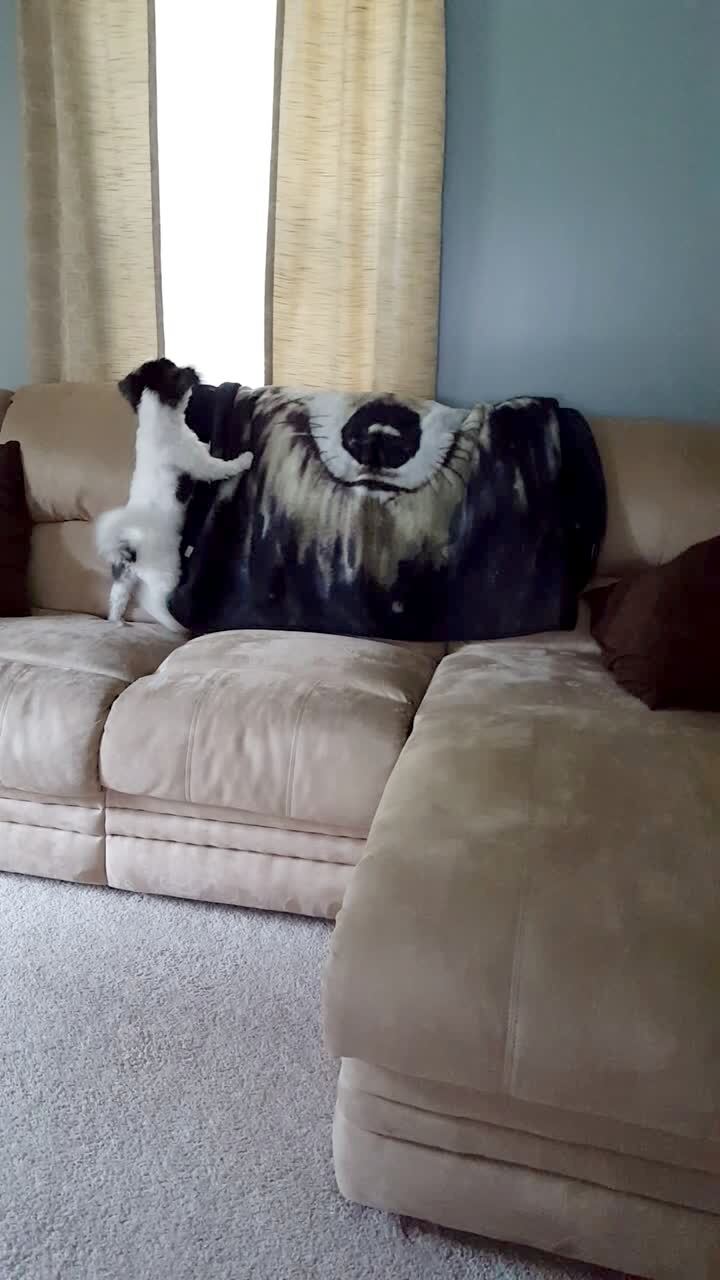 A chihuahua dog flings the bottom half of his body left and right repeatedly indoors.